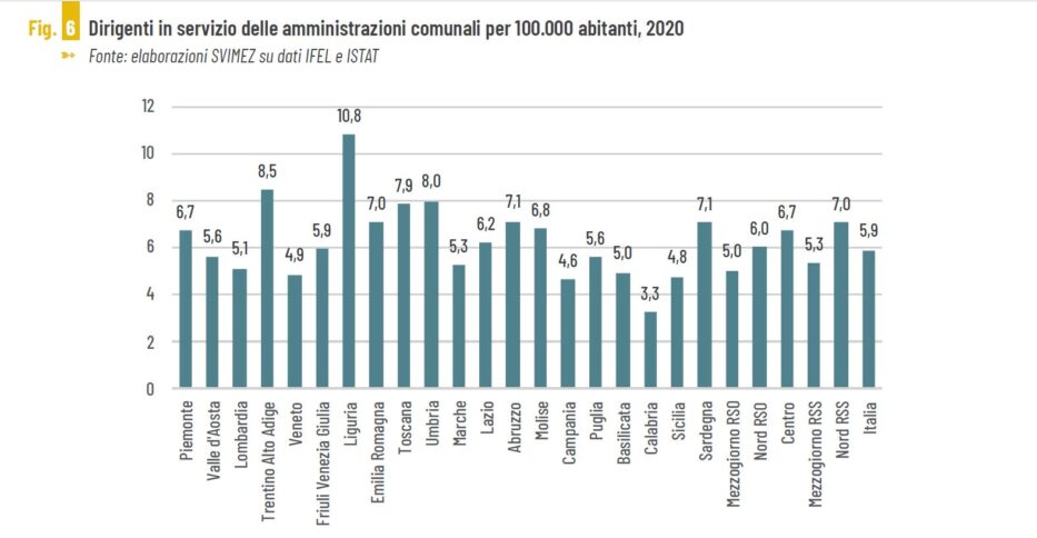Stando a quanto sottolineato dai giudici contabili, per questi enti sussiste inoltre una fragilità del personale non solo dal punto di vista numerico ma anche «qualitativo». Dai numeri dell’Ifel e dell’Istat, rispetto a quest’ultimo aspetto in Calabria risultano in servizio nelle amministrazioni comunali 3,3 dirigenti ogni 100mila abitanti. Il dato più basso in Italia dove la media è pari a 5,9 per 100mila abitanti.