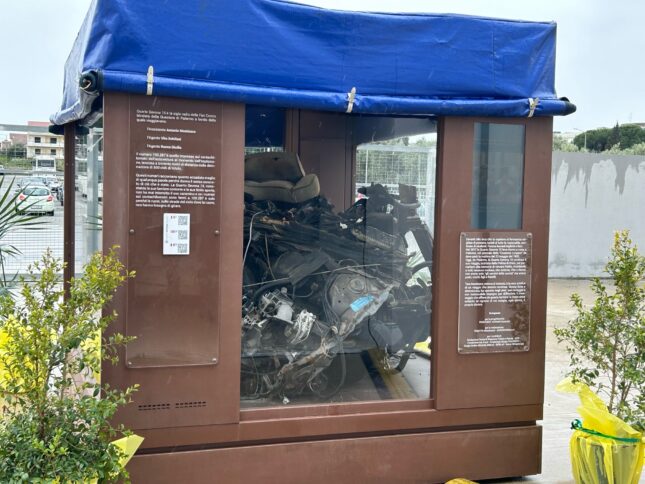 La stessa auto, la Quarto Savona15, che questa mattina è rimasta esposta in una teca a Siderno, presso il Palazzetto dello Sport, durante un incontro a cui hanno partecipato autorità militari, civili, religiose, i referenti dell’associazione “Libera” e gli studenti delle quarte e quinte classi delle scuole di secondo grado del territorio sidernese.