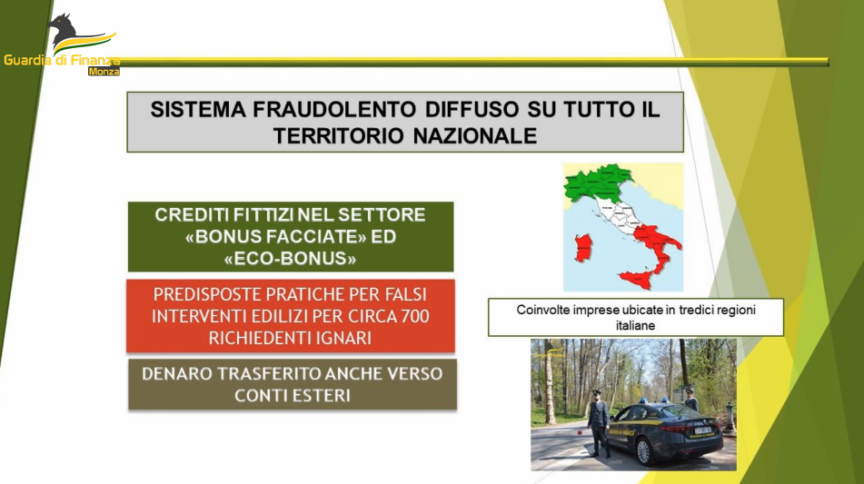 L’indagine su un maxi giro di frode bonus edilizi del Nucleo di Polizia Economico-Finanziaria della Guardia di Finanza di Monza, è partita da anomalie e alert di rischio emersi rispetto a un commercialista calabrese con casa in Brianza, il quale avrebbe acquistato da decine di persone crediti per interventi edilizi “bonus facciata 90%” ed “eco bonus 65%”, per un valore di 13 milioni di euro, facendo partite subito dopo cessioni “a catena” dei medesimi crediti, per lo più lo stesso giorno, poi monetizzati presso Poste Italiane.