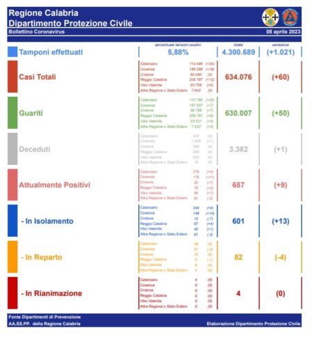 In Calabria, ad oggi, il totale dei tamponi eseguiti è stato pari a 4.300.689 (+1.021). In particolare l’andamento dell’epidemia nella regione è la seguente: