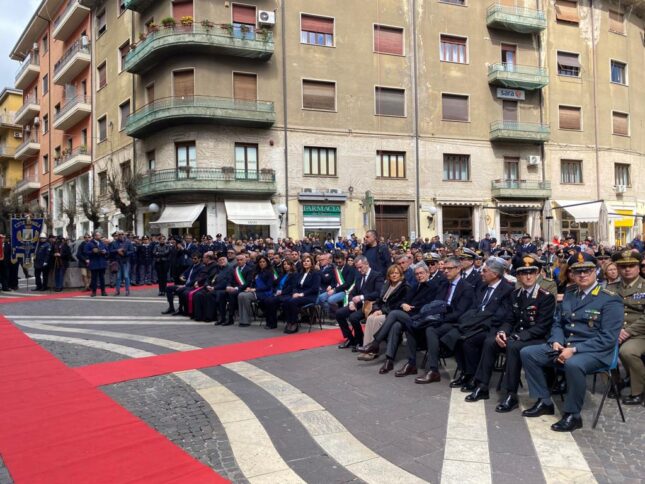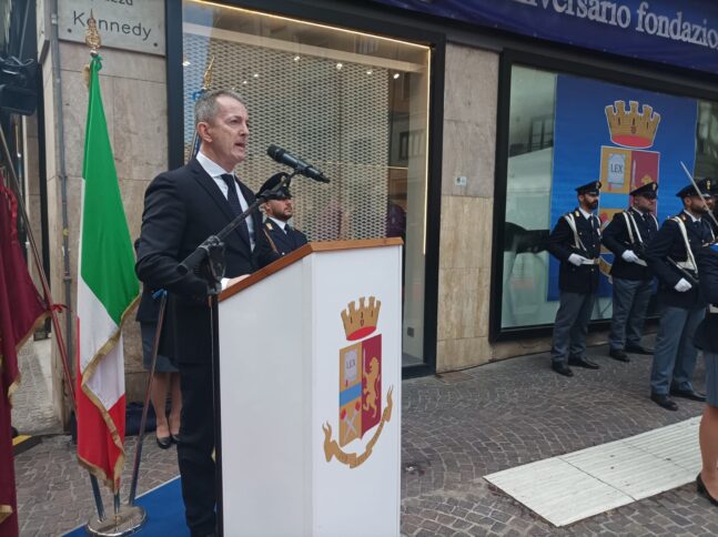 COSENZA La centralissima Piazza Kennedy a Cosenza è gremita. Il Questore di Cosenza, Michele Maria Spina, in occasione della celebrazione del 171esimo anniversario della Polizia di Stato ha deciso di coinvolgere tutti i cittadini, nessuno escluso. La piazza è priva di transenne e riempita di sedie, tutti prendono posto in attesa dell’inizio della cerimonia minacciata da qualche innocua nuvola che poi lascia spazio al sole. Le preghiere del Questore hanno sortito gli effetti sperati, è lo stesso Spina nel suo discorso a sottolineare la speranza di allontanare il pericolo pioggia per garantire la perfetta riuscita dell’evento. «Abbiamo fortemente voluto celebrare in una piazza centrale di Cosenza. Perché oltre ai nostri invitati ci siano anche cittadini, i passanti, incuriositi dalla presenza dell’orchestra meravigliosa dell’Istituto Lucrezia della Valle sperando che ci guardino con simpatia», confessa il Questore al Corriere della Calabria. «C’è uno schieramento di poliziotte e poliziotti giovanissimi che per fortuna sono venuti in servizio a Cosenza e noi festeggiamo 171 anni, ed è bello ammirare tanti giovani ancora vogliosi e desiderosi di contribuire a migliorare la società».
