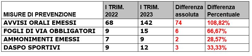 Anche dal confronto tra il I Trimestre 2023 con lo stesso trimestre dell’anno precedente si registrano tutti dati positivi, che nel caso degli Avvisi orali emessi registrano un +108,83%.
