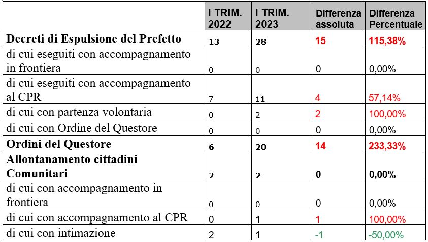 Ed incremento di attività si evince anche nell’azione di contrasto all’immigrazione clandestina. In particolare dai dati della Questura emerge nel primo trimestre del 2023, un tasso in crescita sia dei decreti emessi dal Prefetto di espulsione (+115,38%) sia degli ordini del Questore (+233,33%).