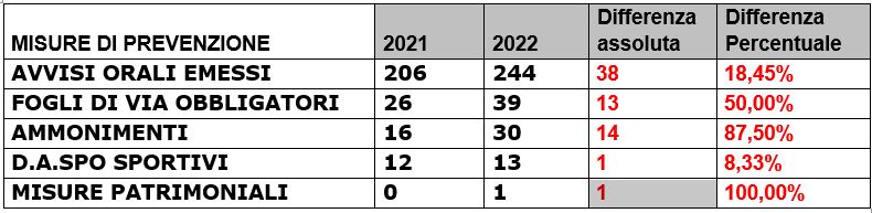 Anche in materia di prevenzione attuata attraverso provvedimenti di natura amministrativa segnano un incremento. Indice della maggiore attenzione esplicata dalle forze dell’Ordine sotto il coordinamento della Questura come autorità proponente.