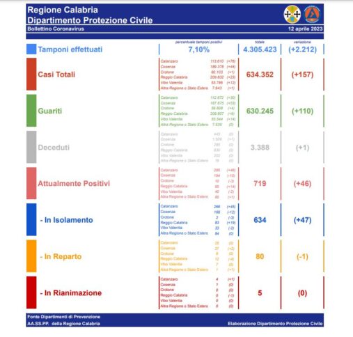CATANZARO Le persone risultate positive al Coronavirus sono 634352 (+157) rispetto a ieri.