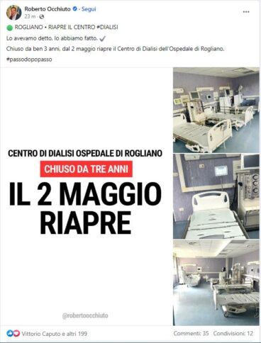 ROGLIANO Il centro di dialisi di Rogliano riaprirà il prossimo 2 maggio. È quanto annuncia con un post sul proprio profilo facebook, il governatore nonché commissario alla Sanità, Roberto Occhiuto. «Lo avevamo detto – scrive – lo abbiamo fatto. Chiuso da ben 3 anni, dal 2 maggio riapre il Centro di Dialisi dell’Ospedale di Rogliano».