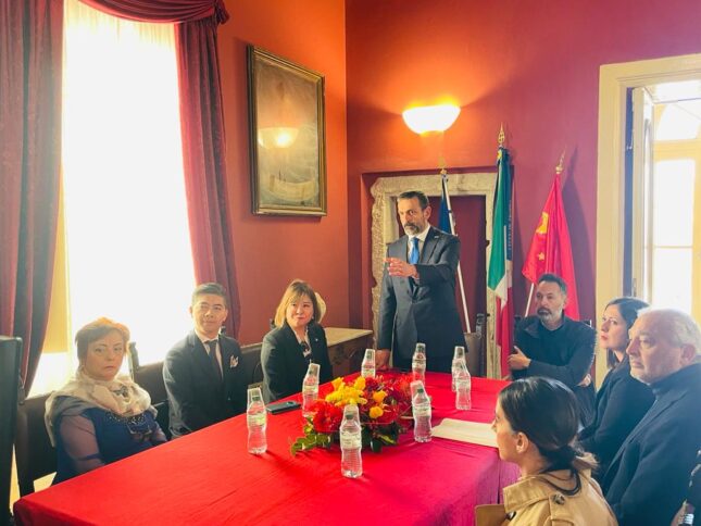 A darne notizia con soddisfazione è il Primo Cittadino Giovanni Macrì che accogliendo l’invito formale destinato al Comune ha ricevuto ufficialmente nel prestigioso Antico Sedile dei Nobili, Elena Majun, presidente dell’associazione internazionale culturale e del turismo, in rappresentanza delle istituzioni della Provincia dello Sichun, nella parte sud occidentale della Cina, la terza più popolata di quel Paese con un’estensione di 485.000 chilometri quadrati, 53 etnie ed una popolazione di 90 milioni di abitanti e della Città prefettura e capoluogo di Nanchino (Nancong), da millenni una delle più importanti città cinesi, molto rilevante nel contesto della storia e della cultura nazionale, già capitale, secondo polo commerciale della Cina orientale dopo Shanghai e classificata seconda tra le città con il maggior sviluppo sostenibile; e l’avvocato Xu Zhongliang, in rappresentanza del famoso Studio Legale Internazionale YingKe, fondato nel 2001 con sede a Pechino, con 97 filiali nazionali e 83 studi legali membri nei principali centri finanziari, commerciali e normativi in Asia, Europa, Sud America e Nord America, considerato il più grande studio legale a investimento diretto in Asia Pacifico, con più di 12.000 avvocati e professionisti; insieme alla dottoressa Francesca Galea ed agli imprenditori Federico Biancospino e Gaspare Voce.