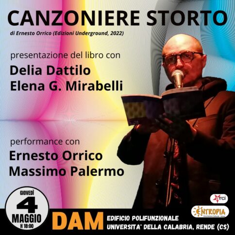 COSENZA Verrà presentato domani, giovedì 4 maggio, a Rende, il nuovo libro di Ernesto Orrico “Canzoniere Storto” (2022, Edizioni Underground?). L’appuntamento è fissato per le 18 al Dam/ Entropia dell’Università della Calabria. Arricchito da una densa prefazione di Angela Albanese, il libro dell’attore e regista teatrale cosentino, raccoglie poesie e flussi di coscienza che trovano nella lettura pubblica la loro naturale espressione. Lo stesso Orrico, non nuovo ad esperimenti letterari di diverso genere, presenta i suoi scritti in una performance appassionata e sempre diversa, immersa nei paesaggi sonori generati dai synth di Massimo Palermo.