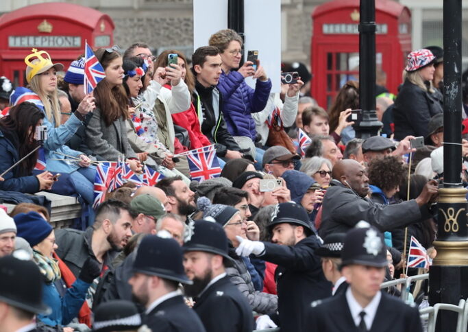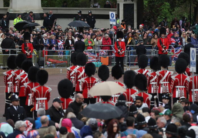 Con i sovrani, i principi di Galles, William e Kate, i loro figli e gli altri membri di casa Windsor attivi. Assente invece, come previsto, il principe ribelle Harry, fratello minore di William. Il sorvolo della Raf è stato limitato ad alcuni elicotteri e alla pattuglia acrobatiche delle Red Arrows a causa del maltempo.