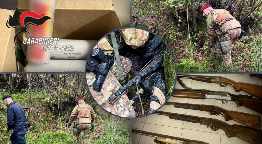 FABRIZIA I Carabinieri della Stazione di Fabrizia, dello Squadrone Cacciatori e degli Artificieri Antisabotaggio del Comando Provinciale di Catanzaro, nell’ambito della continua attività coordinata dalla Procura della Repubblica di Vibo Valentia, guidata dal Procuratore Camillo Falvo, volta a contrastare la circolazione illegale di armi e alla sottrazione delle stesse alle organizzazioni criminali che operano sul territorio, sono intervenuti in un casolare nelle campagne di Fabrizia dove dopo un primo rinvenimento di 8 candelotti pirotecnici, ad alto potenziale esplosivo, di probabile fattura artigianale e di genere vietato hanno esteso la perquisizione alle aree adiacenti recuperando in diversi punti complessivamente 7 fucili cal. 12 e 3 pistole in cal.9, 22 e 6.35 oltre a svariato munizionamento cal. 12 per fucile e cal. 22 per pistola.