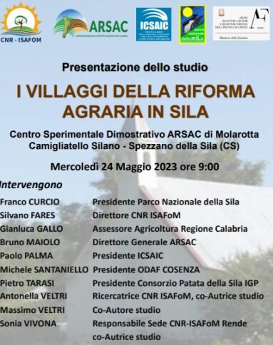 COSENZA “I villaggi della riforma agraria in Sila”. È il titolo dello studio che sarà presentato mercoledì 24 maggio, alle ore 9,00, presso il Centro Sperimentale Dimostrativo ARSAC di Molarotta, a Camigliatello Silano, nel comune di Spezzano della Sila.