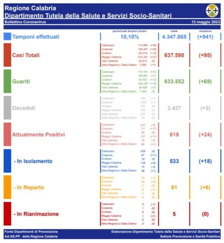 CATANZARO Le persone risultate positive al Coronavirus sono 637.598 (+95) rispetto a ieri. Questi sono i dati giornalieri relativi all’epidemia da Covid-19 comunicati dai Dipartimenti di Prevenzione delle Aziende sanitarie provinciali della Regione Calabria.