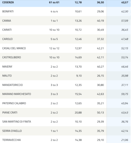 In provincia di Catanzaro la percentuale è del 47,50% (elezioni precedenti 58,68%) e nel Cosentino 45,76% (58,28%). Percentuale bassa anche per Reggio Calabria, dove è andato a votare il 45,52% degli elettori (precedenti elezioni 54,74%).
