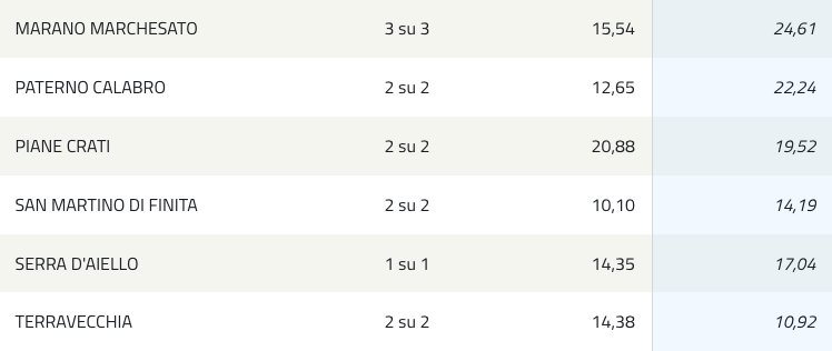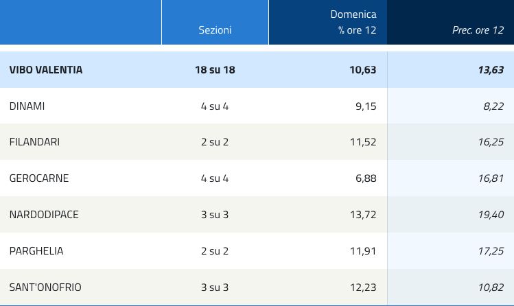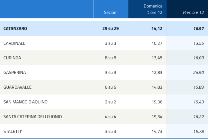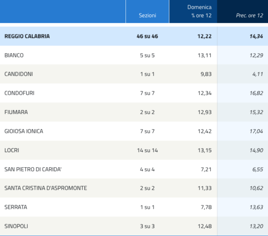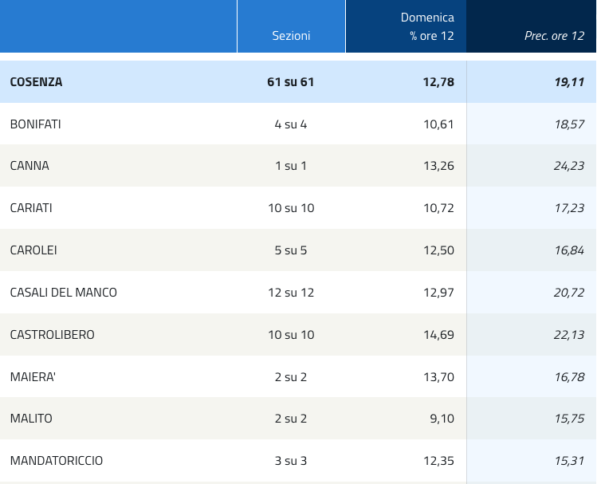 Non fa (quasi) più notizia: il dato dell’affluenza nei 41 comuni chiamati al voto per questa tornata di elezioni amministrative è basso. In Calabria, alle 12, si è recato alle urne il 12,72% degli aventi diritto, con un calo percentuale di circa 4 punti rispetto alle precedenti comunali (16,87%). In provincia di Catanzaro la percentuale è del 14,12% (precedente del 16,97%); nel Cosentino del 12,78% (19,11%); in provincia di Crotone del 14,54% (18,97%); nel Reggino del 12,22% (14,34%); in provincia di Vibo Valentia del 10,63% (13,63%). Di seguito il dato comune per comune.