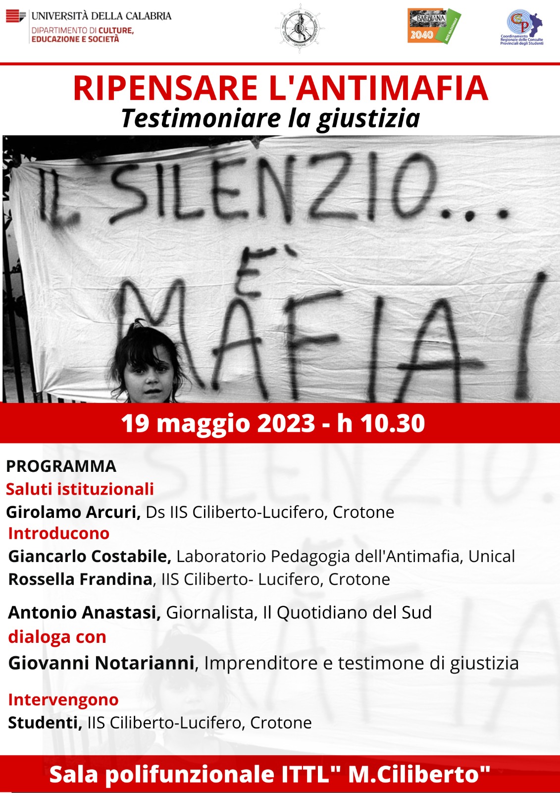 “Testimoniare giustizia, costruire speranza” è il tema del nuovo seminario del ciclo “Ripensare l’Antimafia” organizzato dal corso universitario di Pedagogia dell’Antimafia attivo presso il Dipartimento di Culture, Educazione e Società dell’Università della Calabria e dall’Istituto Ciliberto di Crotone. L’iniziativa si terrà venerdì 19 maggio alle ore 10:30 presso la Sala Polifunzionale della scuola crotonese.