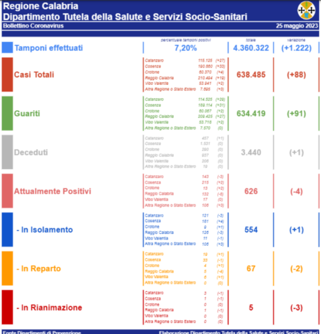 CATANZARO Le persone risultate positive al Coronavirus sono 638485 (+88) rispetto a ieri. Un decesso registrato. Questi sono i dati giornalieri relativi all’epidemia da Covid-19 comunicati dai Dipartimenti di Prevenzione delle AA.SS.PP. della Regione Calabria. In Calabria, ad oggi, il totale dei tamponi eseguiti sono stati 4360322 (+1.222).