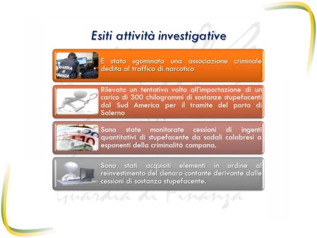 Per gli inquirenti, quelli sgominata era a tutti gli effetti un’associazione «itinerante» tra Calabria ed Agro nocerino sarnese. Le forniture di droga, per lo più cocaina, erano principalmente per Luigi Vicidomini che si avvaleva della preziosa collaborazione del 49enne oplontino Domenico Tamarisco (entrambi raggiunti da misura cautelare in carcere) che faceva da «ponte» tra le cosche calabresi e quelle dell’Agro nocerino e dell’hinterland partenopeo. E anche a Torre Annunziata arrivavano forniture – riporta ancora Il Mattino – tramite corrieri calabresi che Tamarisco, detto Nardiello, aveva reclutato a Scalea dove era sottoposto alla sorveglianza speciale di Ps proprio per i suoi precedenti specifici.