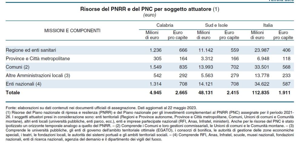 Ebbene, dalla lettura dei dati offerti dagli analisti di Palazzo Koch, la Calabria risulta destinataria di fondi già assegnati decisamente cospicui. Alla data del 22 maggio scorso, passando a setaccio i bandi e i decreti di assegnazione delle somme in pancia al Pnrr e al Piano nazionale per gli investimenti complementari (Pnc), i soggetti attuatori avrebbero già ottenuto il trasferimento di circa 5 miliardi complessivi (esattamente 4,4 dal Pnrr e 0,6 dal Pnc) per realizzare interventi nella regione. Una somma che complessivamente vale il 4,4% del totale nazionale.