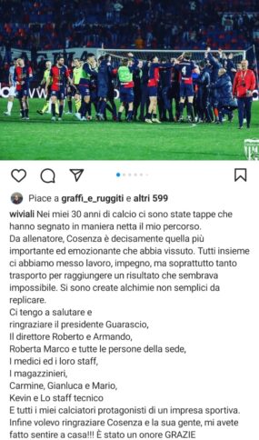 Si sono create alchimie non semplici da replicare. Ci tengo a ringraziare il presidente Guarascio, il direttore Roberto e Armando, Roberta Marco e tutte le persone della sede, i medici e il loro staff, i magazziniere, Carmine, Gianluca e Mario, Kevin e lo staff tecnico. E tutti i miei calciatori protagonisti di un’impresa sportiva. Infine volevo ringraziare Cosenza e la sua gente, mi avete fatto sentire a casa. È stato un onore, grazie”.
