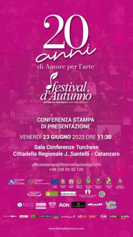 CATANZARO Si terrà domani, venerdì 23 giugno, la conferenza stampa di presentazione del Festival d’Autunno – 20 di amore per l’arte. Il programma dell’edizione di quest’anno, la cui direzione artista è affidata ancora ad Antonietta Santacroce, verrà illustrato alle 11.30 nella Sala Conferenze Turchese della Cittadella regionale Jole Santelli a Catanzaro. Nei giorni scorsi Santacroce, in attesa di conoscere il cartellone della ventesima edizione del festival, aveva tenuto a evidenziare la conferma di una delle sue iniziative più riuscite, Next Music Generation, il talent nato dal desiderio di valorizzare le realtà musicali che operano sul territorio, promuovendole attraverso l’opportunità, unica, di essere inseriti nel cartellone della rassegna, e quindi di potersi confrontare con il suo pubblico, godendo della sua visibilità mediatica. Domani, di questo e di tanto altro, se ne saprà di più.