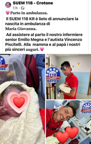 La piccola si chiama Maria Giovanna e ad assistere alla sua nascita c’erano «l’infermiere “senior” Emilio Megna e l’autista Vincenzo Piscitelli», si legge in un post del Suem. I sanitari hanno anche formulato alla madre e al padre della piccola «i più sinceri auguri». Un intervento coordinato dall’infermiere perché l’ambulanza non aveva il medico a bordo. (redazione@corrierecal.it)