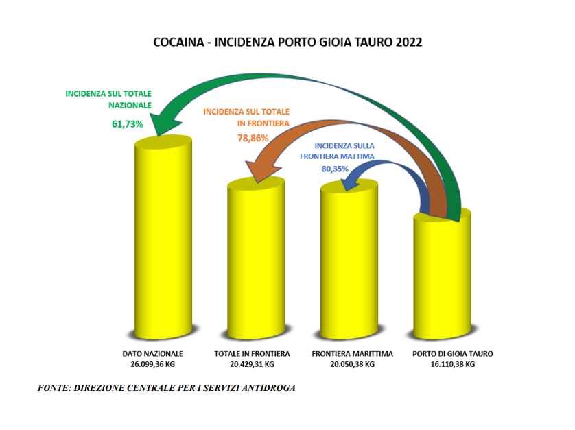 A livello nazionale, nel 2022 il porto reggino è stato quello in cui è stata sequestrata la più alta quantità di cocaina: 16.110,38 kg, pari all’80,35% dei quantitativi rinvenuti presso la frontiera marittima (20.050,38), al 78,86% del totale della cocaina rinvenuta presso tutte le frontiere (20.429,31 kg) e al 61,73% dell’ammontare della cocaina sequestrata a livello nazionale (26.099,36 kg)], seguito da quello di Civitavecchia (1.187,19 kg) e di Trieste (730 kg).