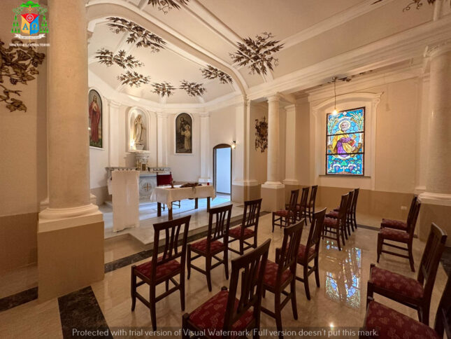 «La cappella, di forma rettangolare, con una navata principale e due piccole navate laterali che permettono l’accesso a due locali (sacrestie) alle quali si può anche accedere dalla zona del presbiterio, probabilmente – aggiunge Pascuzzi – è sempre stata presente nell’immobile, utilizzata prima dalle suore e successivamente dai seminaristi e dai loro istitutori. Anch’essa, come l’intero edificio, ha subito numerose trasformazioni ed ha vissuto fasi di utilizzo e di abbandono legate alla più o meno intensa attività del seminario; ultime vestigie del passato di cappella conventuale sono la una grata, nei pressi dell’ingresso, al di là della quale le suore partecipavano alla funzione religiosa ed un foro circolare nella muratura dal quale veniva loro somministrata la comunione. L’attuale veste decorativa risale al 1984 quando il Vescovo Vincenzo Rimedio, Vescovo di Lamezia Terme dal 1982 al 2004, decide di restaurare e rimettere in attività la cappella che non era più in funzione da circa quindici anni». Questi alcuni interventi che hanno riguardato la cappella: sostituzione delle pavimentazioni, nell’aula e sul presbiterio con l’intento di uniformare il materiale e le tonalità, prima di colori diversi tra presbiterio ed aula ed anche nella stessa aula; messa a norma dell’impianto elettrico e sostituzione dei vecchi apparecchi illuminanti con nuovi elementi a tecnologia led; raschiatura delle vecchie pitturazioni e della verniciatura acrilica dello zoccolo; messa a norma dell’ingresso all’ascensore per il raggiungimento della cappella; restauro della volta in cannucciata; rifacimento della pitturazione interna; restauro delle porte e degli infissi; pulizia completa delle parti lignee, con spazzolatura, raschiatura del legno degradato, aspirazione di tutti i residui di deposito, polvere e sporco; trattamento delle centine, dei tambocci e del cannucciato che, in alcune parti, è stato sostituito con un nuovo cannucciato.