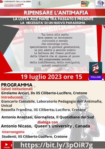 RENDE “La lotta alle mafie tra passato e presente: la necessità di un nuovo paradigma” è il tema del webinar organizzato dal corso universitario di Pedagogia dell’Antimafia attualmente attivo presso il Dipartimento di Culture, Educazione e Società dell’Università della Calabria e dall’Istituto Ciliberto di Crotone che si terrà domani, mercoledì 19 luglio, nel giorno di Paolo Borsellino e della strage di via d’Amelio, alle 15. L’incontro potrà essere seguito all’indirizzo: https://bit.ly/3pOiR7g. Il seminario online sarà aperto dai saluti istituzionali di Girolamo Arcuri, Dirigente Scolastico dell’Istituto Ciliberto di Crotone, e prevede le introduzioni di Giancarlo Costabile, laboratorio di Pedagogia dell’Antimafia Dices Unical, e Rossella Frandina, docente di Lettere del Ciliberto. A dialogare con Antonio Nicaso, saggista e docente universitario negli USA e in Canada, sarà il giornalista del Quotidiano del Sud, Antonio Anastasi, mentre gli studenti e le studentesse del Ciliberto, Team I Disobb3dienti, animeranno infine il dibattito con i loro interventi e domande. Antonio Nicaso è tra i massimi studiosi al mondo del fenomeno mafioso di matrice ‘ndranghetista e autore con Nicola Gratteri di una corposa storiografia sulla mafia calabrese. L’obiettivo del webinar è tracciare nuove piste di ricerca per ridefinire l’esperienza dell’antimafia sociale, i cui obiettivi culturali e strategie educative necessitano di una profonda rivisitazione. Le mafie sono oramai una componente strutturale del capitalismo globale, come osservato opportunamente da Nicaso, che condiziona l’intero ciclo di produzione della ricchezza mondiale. Questa nuova evidenza scientifica non può che portare tutte le realtà antimafia a riorganizzare il paradigma di contrasto al fenomeno mafioso, assumendo come priorità strategica il progetto di una credibile alternativa di società all’esistente, per preservare le conquiste democratiche del Novecento e la sfera dei diritti di prossimità.