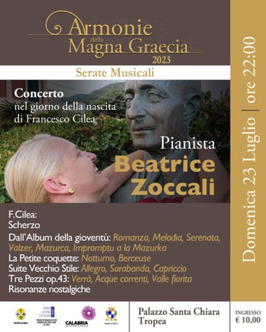 Scherzo dall’Album della gioventù: Romanza, Melodia, Serenata, Valzer, Mazurca Impromptu a la Mazurka La Petite coquette: Notturno, Berceuse. Suite Vecchio Stile: Allegro, Sarabanda, Capriccio Tre Pezzi op.43: Verrà, Acque correnti, Valle fiorita Risonanze nostalgiche. Sono, questi, i brani che la pianista Beatrice Zoccali tra le più raffinate interpreti della musica del compositore calabrese, autrice del libro Il Pianismo di Francesco Cilea, più volte invitata, a Varazze, nella Villa di Francesco Cilea, per suonare lo strumento a lui appartenuto, eseguirà nell’Auditorium di Palazzo Santa Chiara per ricordare l’anniversario della nascita.