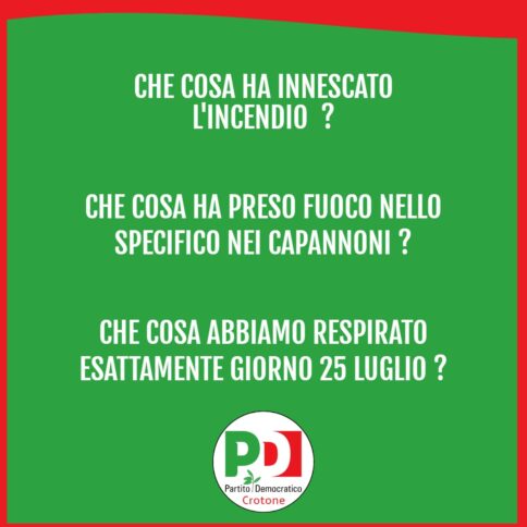 «Molto distanti dalla volontà di creare inutili allarmismi – evidenzia il Partito democratico – riteniamo, allo stesso tempo, che non sia possibile archiviare la vicenda con cotanta semplicità e, soprattutto, con un semplice comunicato attestante i livelli di inquinamento dell’aria. Sicuramente tale comunicato e tali risultati tranquillizzano anche noi ma su altri aspetti, diversamente, pensiamo che vada fatta maggior chiarezza. Cosa ha innescato l’incendio? Che cosa ha preso fuoco nello specifico nei capannoni? Che cosa abbiamo respirato esattamente giorno 25 luglio? Chiediamo alle autorità competenti di fare massima chiarezza su quanto accaduto non certo nell’ interesse politico del Partito Democratico di Crotone, ma solo ed esclusivamente per tutelare la saluta della comunità crotonese».
