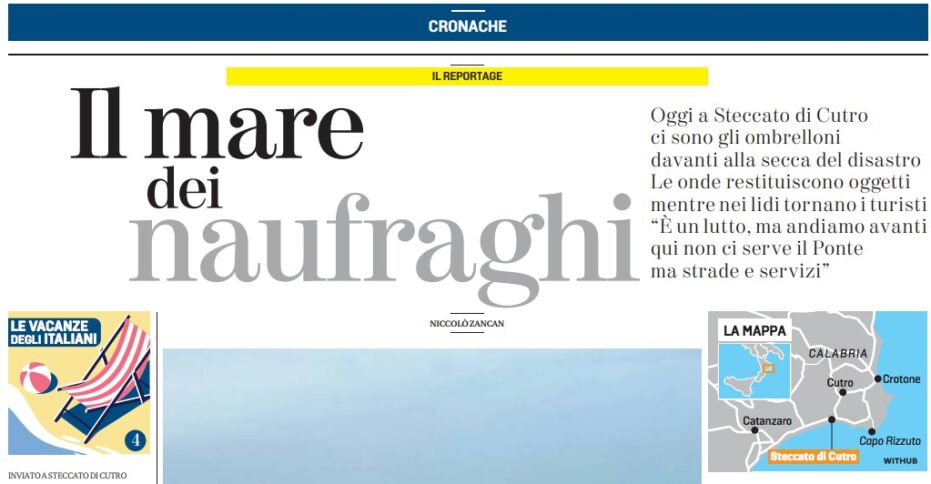 «Per noi è un lutto di famiglia», dice il sindaco di Cutro Antonio Ceraso. «Nel nostro Comune sono state seppellite 8 delle 94 vittime accertate». Ci sono morti ancora senza nome come un bambino identificato come «Kr. M. 8». Nei villaggi le prenotazioni vanno bene. Alla reception del “Madama Club Village” Stefania Salerno spiega: «Non dimentichiamo, ma dobbiamo rimboccarci le maniche. Alla Calabria manca sempre qualcosa. Non è il Ponte sullo Stretto, sono le strade, sono i servizi, è la volontà di tutti di migliorare le cose».