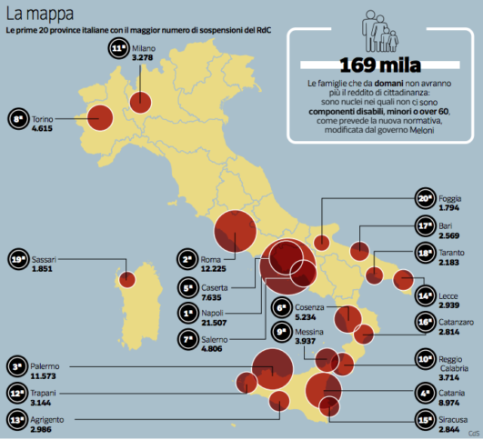 COSENZA Cosenza al sesto posto in Italia con 5.234 sospensioni del Reddito di cittadinanza, Reggio Calabria al decimo posto con 3.714 sospensioni, Catanzaro al sedicesimo con 2.814. La Calabria è tra le regioni più “toccate” dall’intervento del governo Meloni. Quell’sms che ha liquidato 169mila beneficiari della misura ha avuto già una prima conseguenza: quella di far salire l’allarme per possibili tensioni sociali. I sindaci delle principali città calabresi si sono già schierati pubblicamente. Franz Caruso, sentito questa mattina da La Stampa, ha dovuto fare un passo in più, rafforzando le misure di sicurezza intorno agli uffici del Comune. «Abbiamo mandato la polizia municipale», racconta il sindaco. «Per fortuna non ci sono state reazioni violente: i cittadini hanno capito che il Comune non ha responsabilità, anzi a sua volta è una vittima».