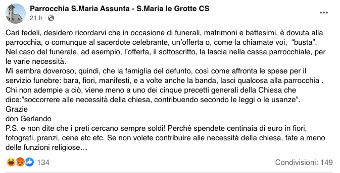 Il parroco (o comunque chi gestisce il profilo social della parrocchia) entra nel dettaglio: «Nel caso del funerale, ad esempio, l’offerta, il sottoscritto la lascia nella cassa parrocchiale, per le varie necessità. Mi sembra doveroso, quindi, che la famiglia del defunto, così come affronta le spese per il servizio funebre: bara, fiori, manifesti, e a volte anche la banda, lasci qualcosa alla parrocchia». Così netto da sembrare poco credibile? Ecco il resto: «Chi non adempie a ciò, viene meno a uno dei cinque precetti generali della Chiesa che dice: “soccorrere alle necessità della chiesa, contribuendo secondo le leggi o le usanze”». Insomma, non lesinate con le offerte, visto che di denari se ne spendono tanti. Don Gerlando, o chi per lui, ringrazia. Con una postilla: «E non dite che i preti cercano sempre soldi! Perché spendete centinaia di euro in fiori, fotografi, pranzi, cene etc etc. Se non volete contribuire alle necessità della chiesa, fate a meno delle funzioni religiose…».