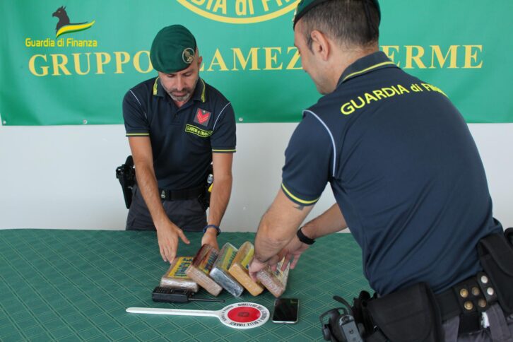 Nel corso del controllo il nervosismo della persona fermata non è sfuggito alle Fiamme Gialle, che hanno approfondito il controllo mediante una perquisizione accurata del mezzo, eseguita con l’ausilio del cane antidroga “Jerry Lee”, il quale, dopo una minuziosa ispezione del mezzo, ha segnalato al proprio conduttore la plausibile presenza di sostanze stupefacenti.