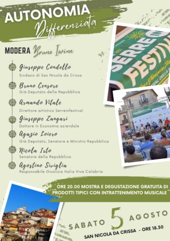 Alle 18.30 a San Nicola da Crissa è previsto l’approfondimento sugli effetti dell’Autonomia differenziata, moderato da Bruno Iovine, con le considerazioni del sindaco Giuseppe Condello, del già deputato Bruno Censore, del direttore artistico del “Serreinfestival” Armando Vitale, del promoter finanziario Giuseppe Zangari, del già presidente della Regione Calabria Agazio Loiero, del senatore Nicola Irto e del responsabile del Settore “Giustizia” di “Italia Viva” Agostino Siviglia. Chiuderanno la mostra di prodotti tipici con degustazione gratuita e lo spettacolo musicale.