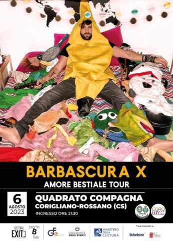 CORIGLIANO ROSSANO «Tutto quello che non volevi sapere sul sesso e che ignoravi di temere, un viaggio irriverente sui metodi di accoppiamento più bizzarri e scomodi del regno animale. Bizzarrie, acrobazie, passioni e tradimenti raccontati rigorosamente male». Lo presenta direttamente lui, Barbascura X, il suo spettacolo “Amore Bestiale” previsto per il 6 agosto, ore 21,30, all’interno dello splendido Quadrato Compagna di Corigliano Rossano.