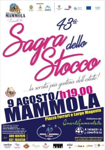 Invece mercoledì 9 agosto, alle ore 19, in piazza Ferrari e largo Magenta a Mammola, si terrà la 43esima edizione della “Sagra dello Stocco”.