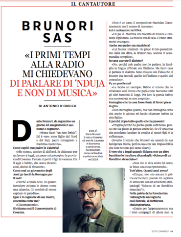 Il magazine 7 del Corriere della Sera per il numero di Ferragosto ha puntato su una storia di copertina che racconta i 20 capoluoghi di Regione in Italia. Per Catanzaro si è scelti di affidare l’intervista al maestro Antonio D’Orrico per ascoltare il cantautore Brunori. Ovvero a due cosentini. E i due ci giocano sull’arcano. Incalza D’Orrico: «Le ricordo che dobbiamo parlare (possibilmente bene) di Catanzaro, la capitale della Calabria, e magari di Reggio, per non scadere nella reunion di cosentini». Brunori sornione risponde: «Noi di Cosenza che parliamo (bene) di Catanzaro, la vedo dura». Da leggere comunque la bella intervista tra il luogo comune della ‘ndujia e altre amenità. A giornalista e cantautore voto “dieci”. A chirillà la giusta protesta per non aver avuto testimonial locali per raccontare il loro capoluogo.