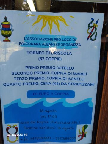 Notizia più ruspante da Falconara Albanese. Il 16 agosto torneo di briscola a 32 coppie organizzato dalla Pro loco. Quota di partecipazione 60 euro ma il montepremi lo vale. In ordine decrescente a partire dal quarto posto: una cena per 4, una coppia di agnelli, una coppia di maiali, al primo classificato un vitello.