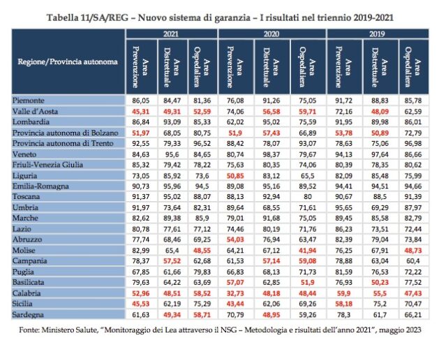 CATANZARO Il dato è ormai cristallizzato: la Calabria risulta inadempiente nelle tre griglie Lea per il 2021. Anche la Corte dei Conti sottolinea e ribadisce il “vulnus” della sanità calabrese, quello della insufficiente qualità dell’assistenza. Un record negativo che la Calabria condivide soltanto con la Valle d’Aosta, almeno in termini assoluti. Nell’ultima relazione sulla gestione finanziaria delle Regioni e delle Province autonome i giudici contabili pubblicano i dati del monitoraggio del ministero della Salute, dati che indicano che nel 2021 la regione consegue un punteggio complessivamente basso in tutte e tre le aree di assistenza», aree che sono la prevenzione, la distrettuale e quella ospedaliera: sono tutte e tre sotto la soglia 60, la soglia di sufficienza in una scala da zero a 100. Per l’area Prevenzione e Distrettuale la sanità calabrese mostra un un peggioramento rispetto al 2019 (sperimentazione); mentre per l’area Ospedaliera, sebbene insufficiente, rileva un lieve miglioramento rispetto alle annualità precedenti. Nella tabella in basso il dettaglio che vede la Calabria fanalino di coda.