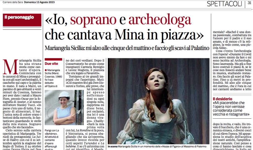 La sua carriera operistica pare aver spiccato il volo. Tre i ruoli da protagonista segnalati dal Corriere: «La Juive» di Halévy con cui il 21 settembre aprirà la stagione del Regio di Torino; il 24 ottobre come Donna Elvira nel «Don Giovanni» di Mozart che Riccardo Muti riprende al Massimo di Palermo; «La Rondine» di Puccini il 4 aprile alla Scala, diretta da Riccardo Chailly. Grandi impegni in arrivo, ma cosa c’entra l’archeologia con l’opera? «Durante il Covid – spiega Mariangela – non avevo niente da fare e mi sono iscritta ad Archeologia. Sono laureanda. Ma già a fine liceo costruii il piano B, se le cose non fossero andate bene in musica, studiando restauro. Ora faccio gli scavi al Palatino. Fino a 13 metri in profondità. Mi alzo alle cinque del mattino, che è l’ora in cui noi cantanti andiamo a letto dopo la recita, e vado. Ho trovato il bucchero, che è una ceramica etrusca, e diversi cocci di cui rilevo l’epoca. Mi appassiona lo studio dell’acustica dei teatri antichi, l’amplificazione naturale. Così penso a cosa ci hanno lasciato e cosa dimentichiamo. In Italia mi piacerebbe che l’opera venisse vista per l’importanza che ha avuto, e non essere considerata come una cosa vecchia e ristagnante. È una battaglia che nasce a scuola, ricordo quanto penai con i professori per il fatto che secondo me Da Ponte e altri librettisti dovrebbero avere lo stesso rispetto dei poeti».