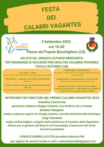 Il professore Giovanni Romeo, medico ricercatore originario di Reggio Calabria, non ha mai dimenticato la sua terra e con la sua rete dei “Calabri Vagantes” ha voluto riunire i tanti calabresi che vivono oggi in Italia e all’estero desiderosi di condividere le loro conoscenze ed esperienze di lavoro con chi vive e opera in Calabria. Il 3 settembre, a partire dalle ore 16.30, si terrà inoltre a Bocchigliero, in Piazza del Popolo, la festa dei Calabri Vagantes (che verrà anch’essa diffusa in streaming).