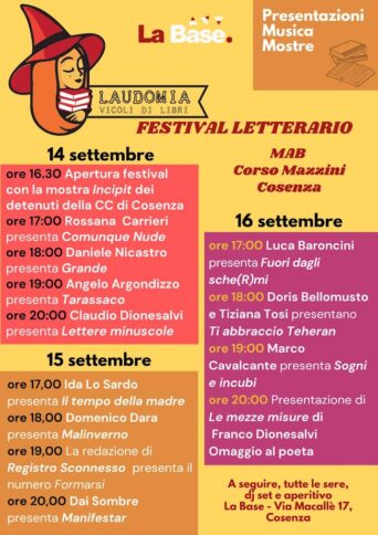 COSENZA Torna a Cosenza il Festival Letterario “Laudomia”, che già l’anno scorso, alla sua prima edizione, ha riscosso un grande successo di pubblico. L’evento si terrà presso le statue del Mab, su Corso Mazzini, nei giorni 14, 15 e 16 settembre. Il titolo di questa edizione è “Lead. Le parole prime”. L’evento è organizzato, come soggetto capofila, da La Base insieme ad alcune librerie indipendenti cittadine (Juna, Mondadori, Raccontami, Ubik), case editrici (Coessenza, Edizioni Erranti, Le Pecore Nere, Talos) e realtà associative (Gaia, La Terra di Piero).