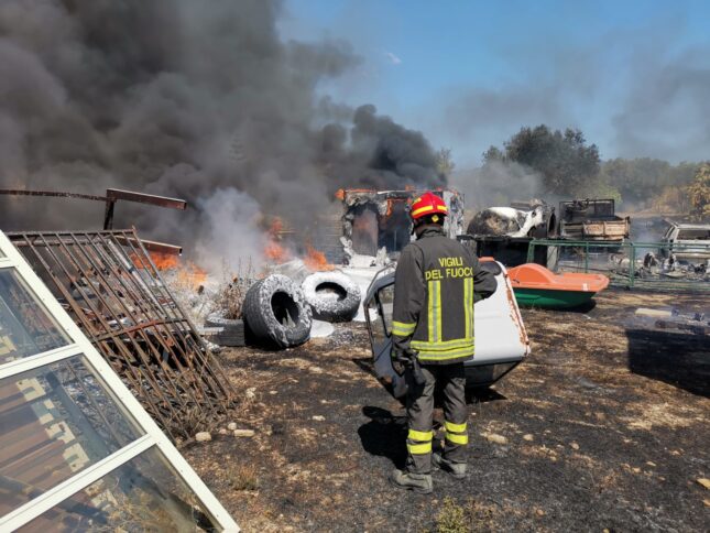 MARINA DI GIOIOSA JONICA Quattro mezzi pesanti e varie attrezzature completamente distrutte è il bilancio di un incendio che questa mattina ha interessato un deposito di un’azienda di Marina di Gioiosa Jonica in provincia di Reggio Calabria. Poco dopo le dieci, la sala operativa provinciale dei Vigili del Fuoco ha allertato le squadre di Siderno per competenza e Monasterace per supporto, che sono intervenute con 10 uomini e tre automezzi. L’incendio, le cui cause sono in corso di accertamento, si è propagato rapidamente ai mezzi pesanti in sosta nel parcheggio e a vari macchinari depositati che, a causa della loro natura, hanno contribuito ad alimentare le fiamme, per le quali si è reso necessario l’utilizzo di liquido schiumogeno e oltre tre ore di intenso lavoro. Il tempestivo e abile intervento dei Vigili del Fuoco ha evitato che l’incendio si propagasse agli altri automezzi in sosta.