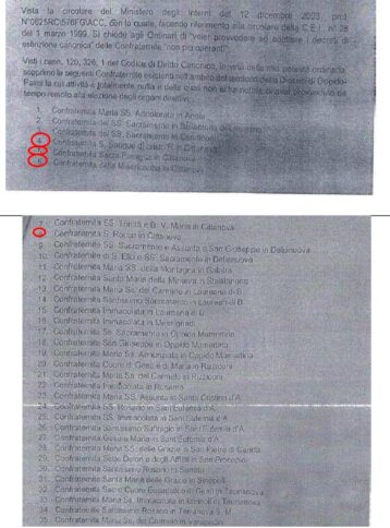 Dagli atti acquisiti al Comune di Cittanova, chi indaga ha ricostruito fatti inerenti il 2007, quando l’allora Vescovo della Diocesi di Oppido Mamertina – Palmi, Monsignor Luciano Bux prende atto dell’esaurita operatività di alcune confraternite aventi sede nel territorio della Diocesi: le cinque di Cittanova, compresa l’unica riconosciuta. Lo stesso Vescovo, constatata l’inoperosità della Confraternite e decide di sopprimerle disponendo il passaggio di tutti i beni residui in carico alla Diocesi.