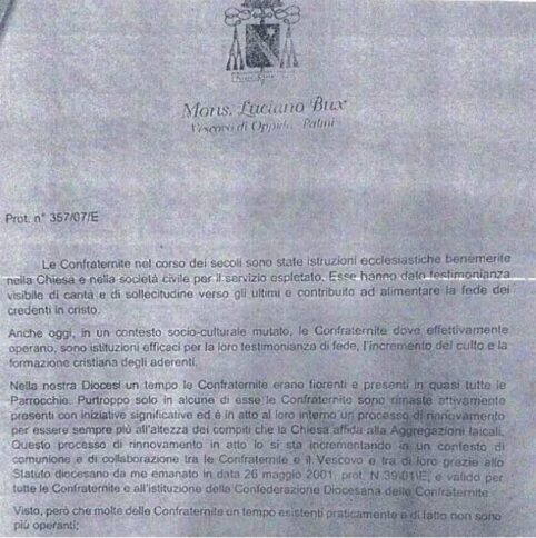 Nel documento, monsignor Luciano Bux sottolinea come le cappelle, edicole, loculi, edificati su suolo cimiteriale ed i beni contenuti, «gestite dalle soppresse Confraternite, non erano di proprietà della Diocesi, essendo esse invece di altrui proprietà (ossia comunale)».