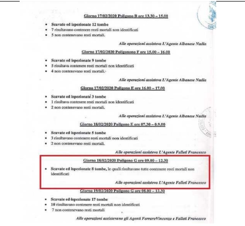 «(…) allora se passate voi allora gli dico alla ditta che state passando magari se si deve iniziare ad impostare un verbale…». Il comandante e Foti si aggiornano telefonicamente già alle 7.42 con lo stesso Foti che invita l’interlocutore a «fare con calma». Foti poi chiama Francesco Deraco per dirgli di aver ottenuto il permesso dal Comandante dei Vigili e poter iniziare i lavori. «(…) tu inizi magari a scavare» spiega Foti a Deraco «e li lasci, senza che le metti nelle cassette» riferendosi ai resti umani. I lavori, dunque, iniziano ma senza la presenza del medico legale Antonio Russo. «(…) mezzogiorno e qualcosa, non ce la faccio perché abbiamo ancora diversi bambini da vaccinare» «domani posso venire tranquillamente». Poi, dal comandante, l’agghiacciante rassicurazione: «Si abbiamo scavato ma solo pochi resti, pochissimo».