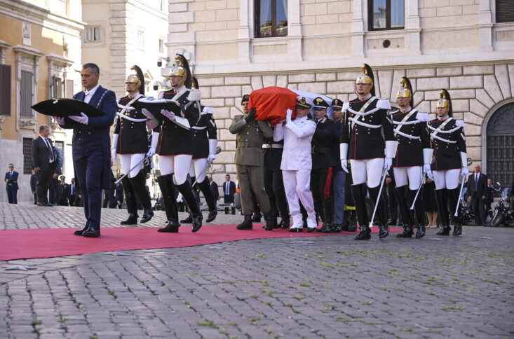 Tra di loro si annoverano il presidente francese Emmanuel Macron e quello tedesco Frank-Walter Steinmeier. Il presidente del Senato Ignazio La Russa ha raggiunto Montecitorio dopo la traslazione del feretro dal Senato dove il 24 settembre si è svolta la camera ardente. Le alte cariche vengono accolte dal picchetto d’onore, eccezionalmente formato da rappresentanti di tutte le forze armate della Repubblica italiana.