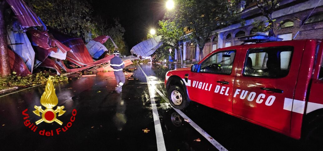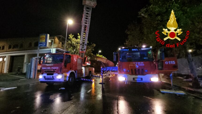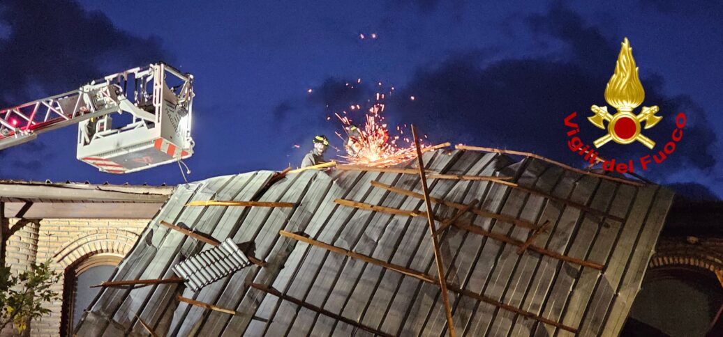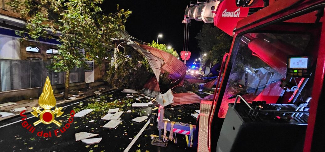 Il forte vento ha altresì divelto alberi che si sono abbattuti sulla sede stradale e numerose anche le richieste per infiltrazioni d’acqua e allagamenti. Vigili del fuoco impegnati alla messa in sicurezza del tetto divelto mentre unità SAF operano sul tetto capannone per rimuovere le parti in imminente pericolo di caduta.