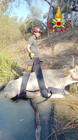 CUTRO Oggi alle 12:50 circa una richiesta di soccorso pervenuta alla sala operativa del comando di Crotone dei vigili del fuoco segnalava un bovino caduto in un dirupo in località Rosito territorio di Cutro. Giunta sul posto la squadra vigilfuoco constatava che l’animale si trovava in difficoltà ed in zona impervia, pertanto si è ritenuto opportuno far intervenire l’elicottero Drago del reparto volo dei vigili del fuoco di Bari per il recupero.